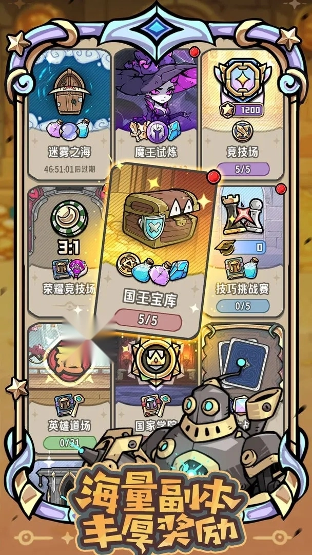 国王宝藏——一场轻松爽快、毫无压力的寻宝之旅;迷雾之海——充满意外惊喜的肉鸽探险;魔王试炼——难度层层加码,赢取SSR装备;还有更多趣味副本,等待你的探索发现。