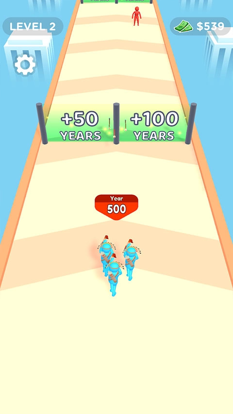 游戏的核心玩法是动作跑酷,其中融入了需要计算的益智元素,还加入了通过击杀敌人来获取收益的射击内容。在武力养成方面,强化方式分为增加人数和跨越年代两种。当玩家的角色进化到特定年代后,就能选择增加人数来提升整体战力,从而在最终的战斗中取得胜利。