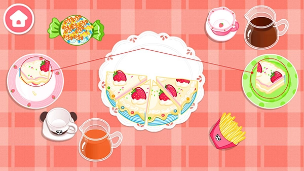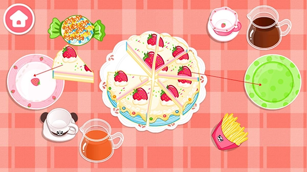 吹完蜡烛后,蛋糕会自动切好,接着让宝宝把切好的蛋糕放进餐盘里。