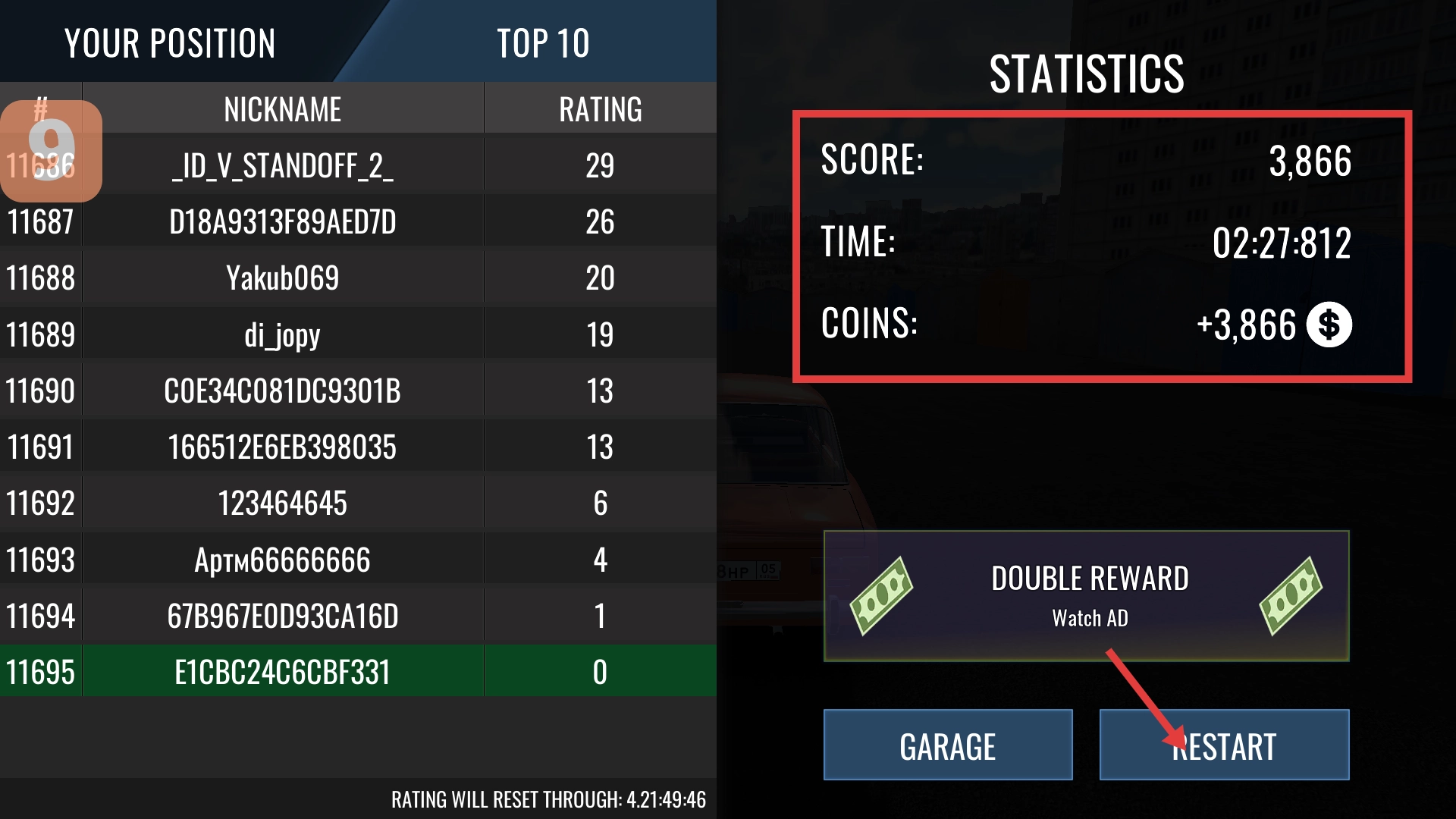 比赛结束后,你可以查看【STATISTICS】,从中获取分数、时间以及金币奖励。之后,你可以选择【RESTART】继续挑战,也可以返回车库。
