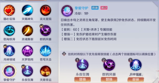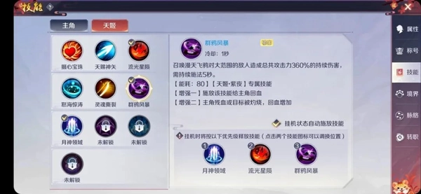 技能前期建议选择荆棘剑阵、圣天三剑和回旋剑击;天姬的技能不推荐搭配流光星陨,原因是该技能的复活效果在此处无法生效。