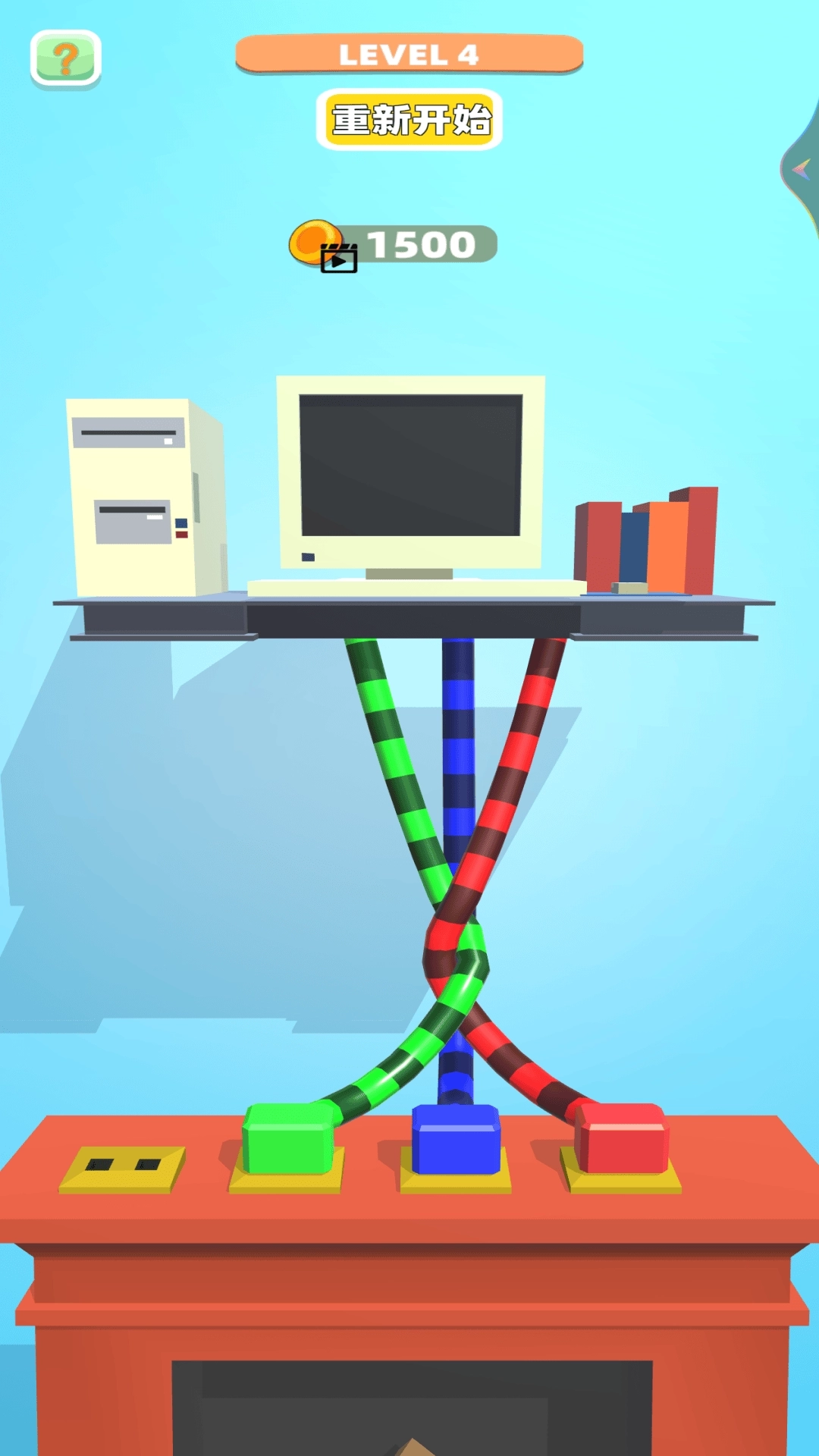 1.这是一款聚焦逻辑解谜的休闲闯关游戏,核心情境围绕电线缠绕与插座匹配展开,引导玩家通过理性推导来完成挑战。