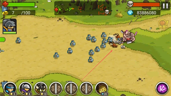 安排蓝色士兵出击,目标是地图上的巨型恶魔敌人,通过战斗收集金币,以此增强士兵的作战能力。