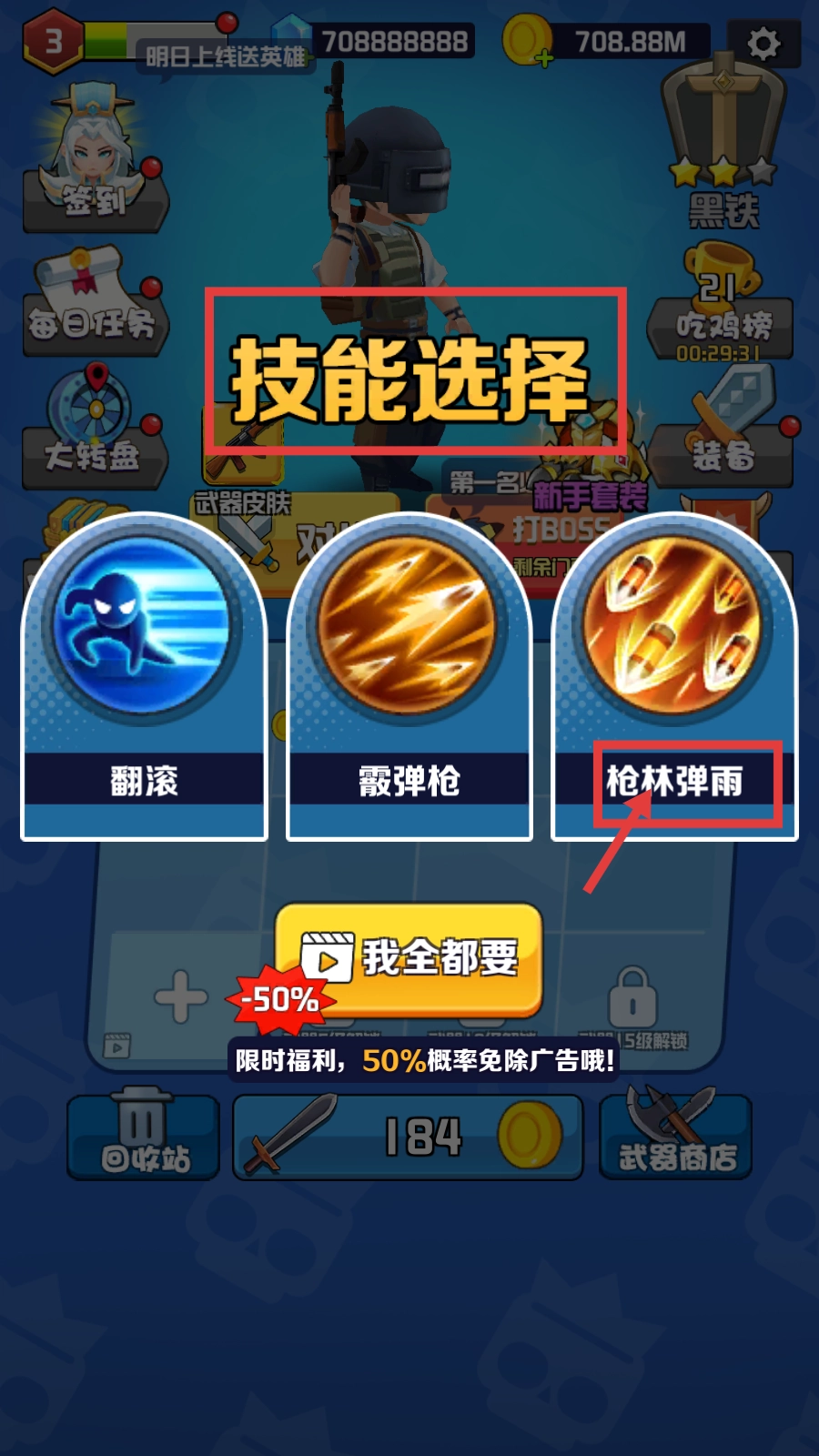 在选择技能时,你可以优先考虑【枪林弹雨】,另外也能借助限时福利【我全都要】——它有50%的概率让你免看广告就能获得所有技能。