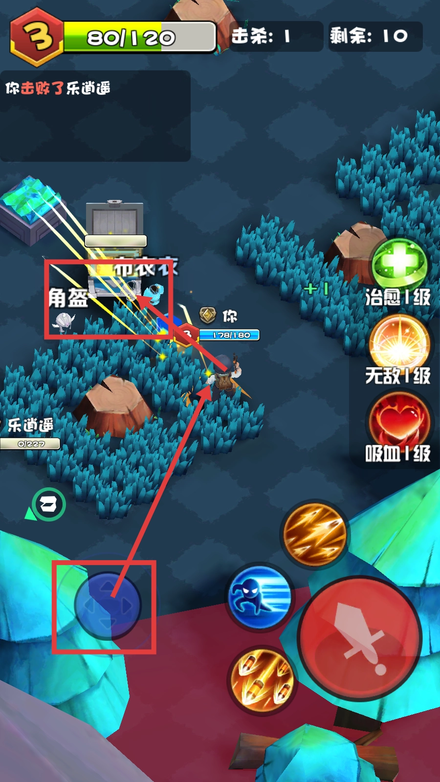 战斗时通过蓝色方向键操控移动,优先收集【角盔】来升级装备,同时搭配【治愈1级-无敌1级-吸血1级】这组技能,以此强化生存能力与输出效果。