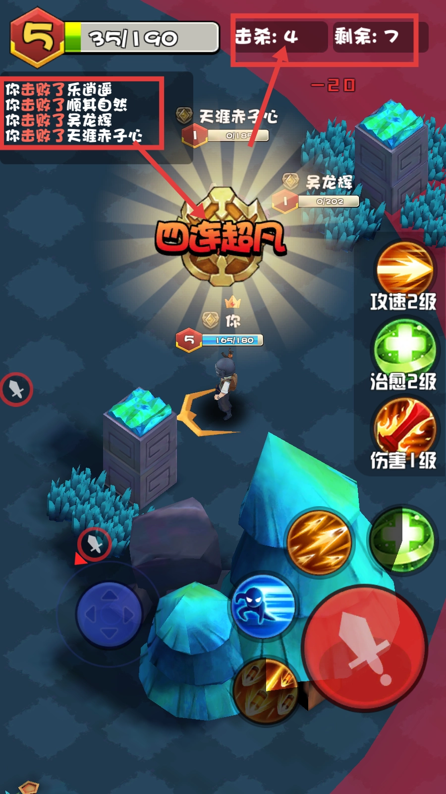 持续作战实现【四连超凡】,留意【击杀:4-剩余:7】的提示,结合【攻速2级-治愈2级-伤害1级】的技能组合来提高连杀效率。
