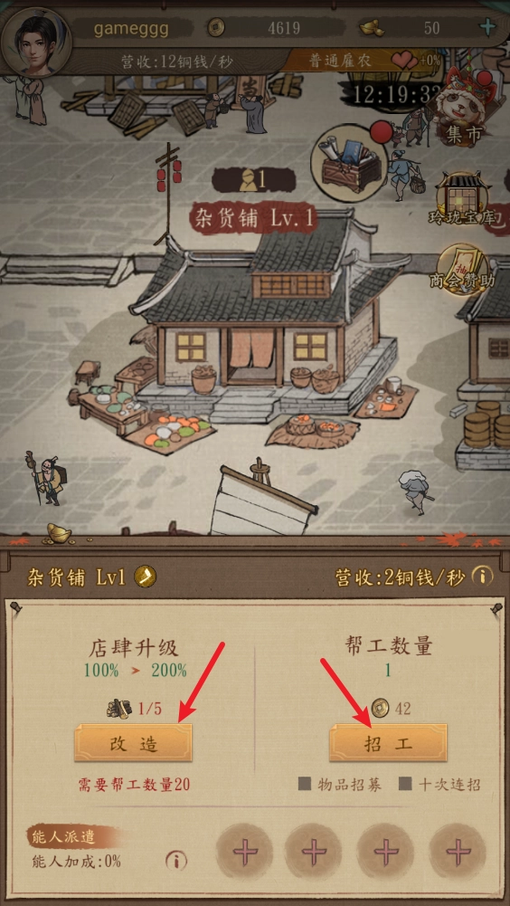 点击商铺,既能够发布招工信息,也可以对店铺进行升级操作,通过这些方式来提升店铺的收益。