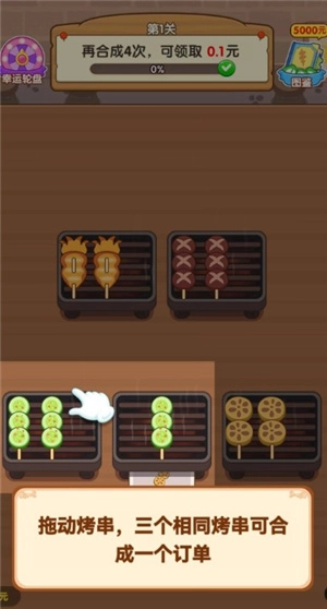 进入游戏后需要将三个相同的烤串放在一起才能合成。