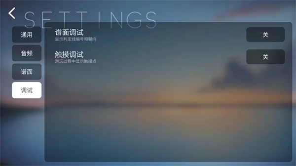设置共分为5大类,“通用”,“音频”,“谱面”,“调试”,“关于”
