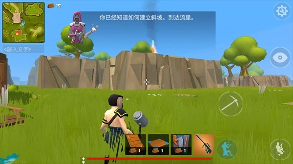 利用木材搭建楼梯上房子获取武器。