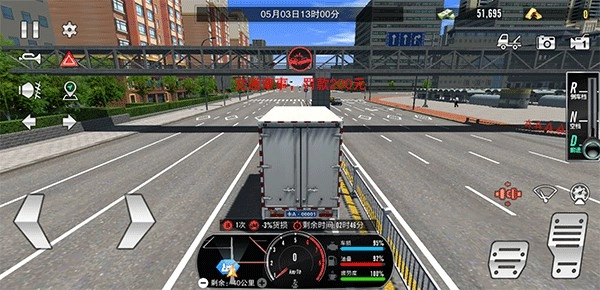 在运输过程中,玩家需借助下方地图导航前往运输终点,途中务必系好安全带(安全带为刹车上方的红色图标),同时要遵守交通规则,避免撞车等情况发生,否则不仅会被罚款扣钱,还会导致货物损坏。