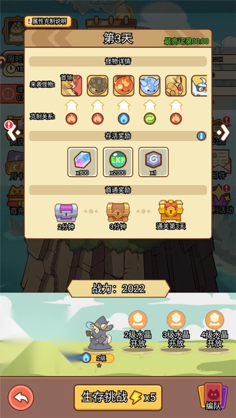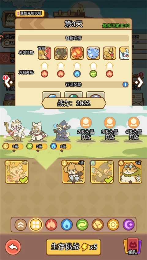 1、进入喵神的迷宫后,点击生存挑战选项,在该界面中你能够了解到当前天数下敌人和BOSS的对应克制关系。