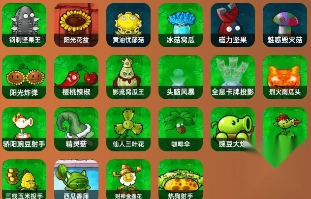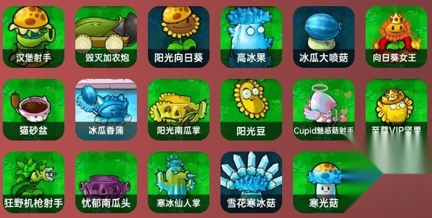 汉堡射手、毁灭加农炮、阳光向日葵、高坚果、冰瓜大喷菇、向日葵女王