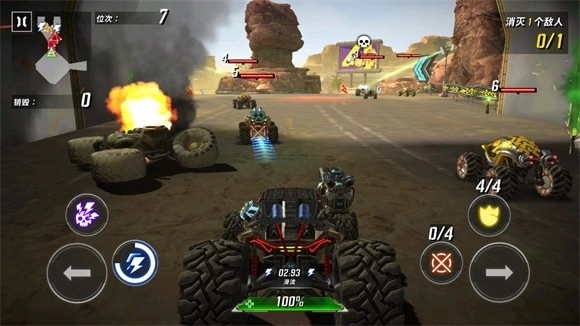 7、进入关卡后左右箭筒控制车辆的转向,蓝色的按钮是冲刺,紫色的按钮是终极技能,红色的瞄准是发射导弹,黄色的盾牌是护盾,这些按钮点击就可以使用。