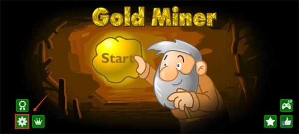 1、打开黄金矿工手机版小游戏,点击界面左下角的设置图标。