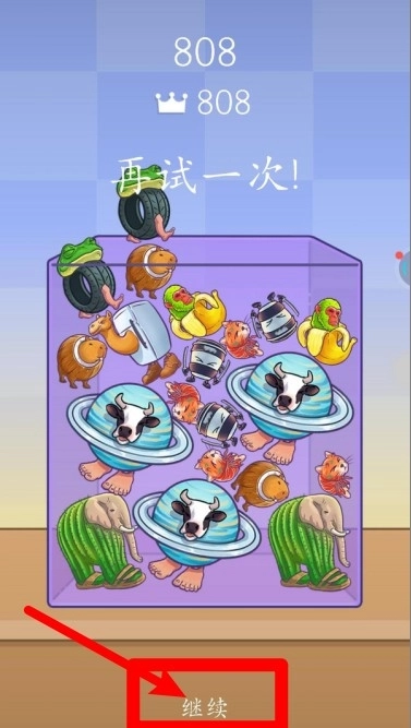 3.当空间被堆满触发“再试一次”提示时,点击底部的继续按钮即可立即开启新局,过程中需总结落点节奏与连锁时机,复盘后能更稳更快地冲击高分。