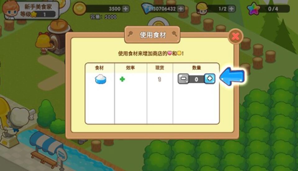 4、在食材使用界面,点击数量旁边的加号按钮,增加食材数量,以此提升商店的爱心和金币获取量。