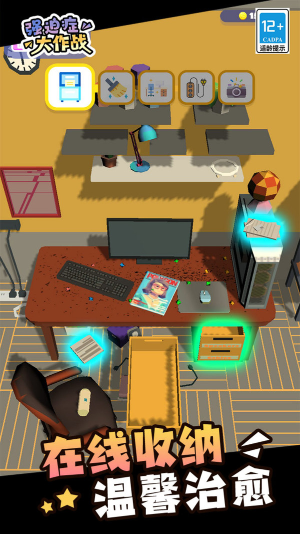 1、开始一系列的收纳挑战,卡通画风打造,玩起来相当的减压;
