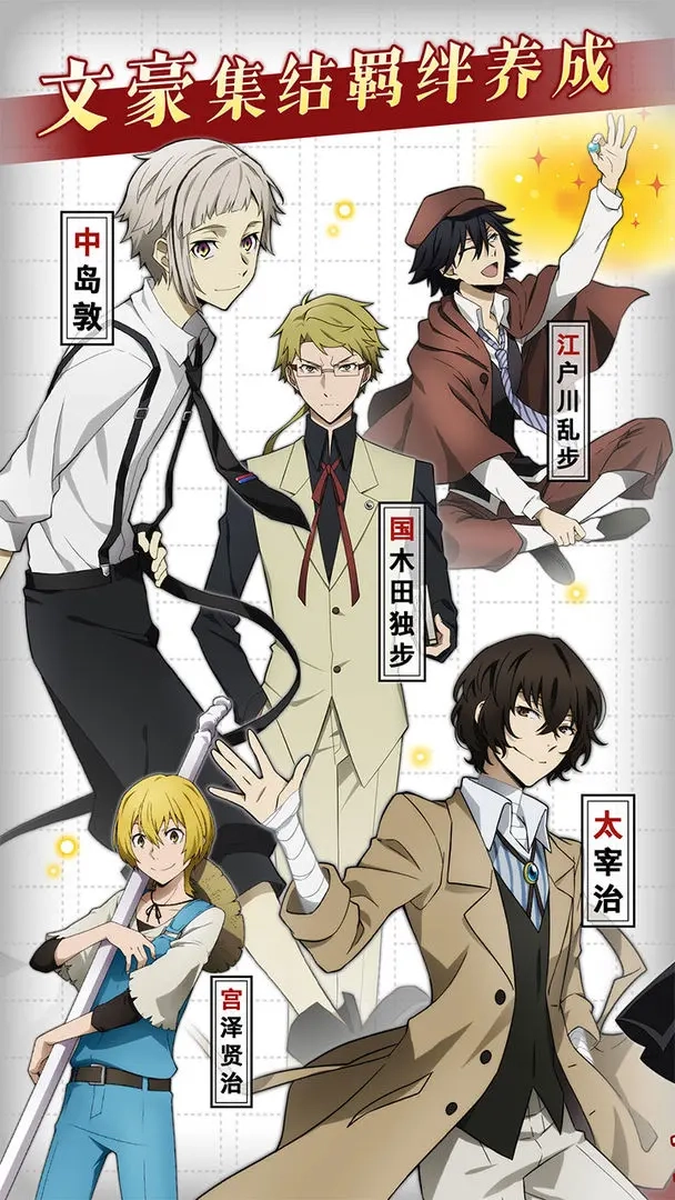 文豪集结,「中岛敦」、「太宰治」、「芥川龙之介」,打造专属自己的队伍,羁绊养成,特色个性,一起成为最强的伙伴。